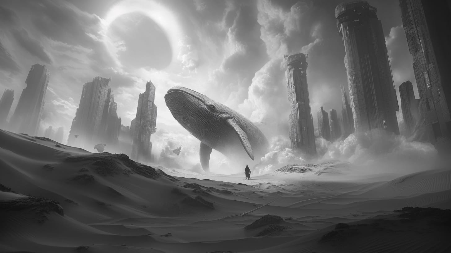 "Black and white pointillism piece of a gargantuan whale emerging from desert sands in a futuristic society, dotted shading, sleek towering structures, swirling dust clouds, epic wide frame, cinematic lighting"